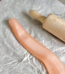2. Place a candle between two pieces of baking paper and roll it carefully with the rolling pin. Flatten the candle a little bit using this method, but leave the bottom round, so you can put it in a candle holder.