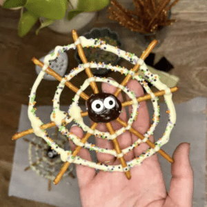 Ich finde diese Halloween-Snacks sind so toll geworden! 🕸️🕷️ Es sind Spinnennetze aus Salzstangen und