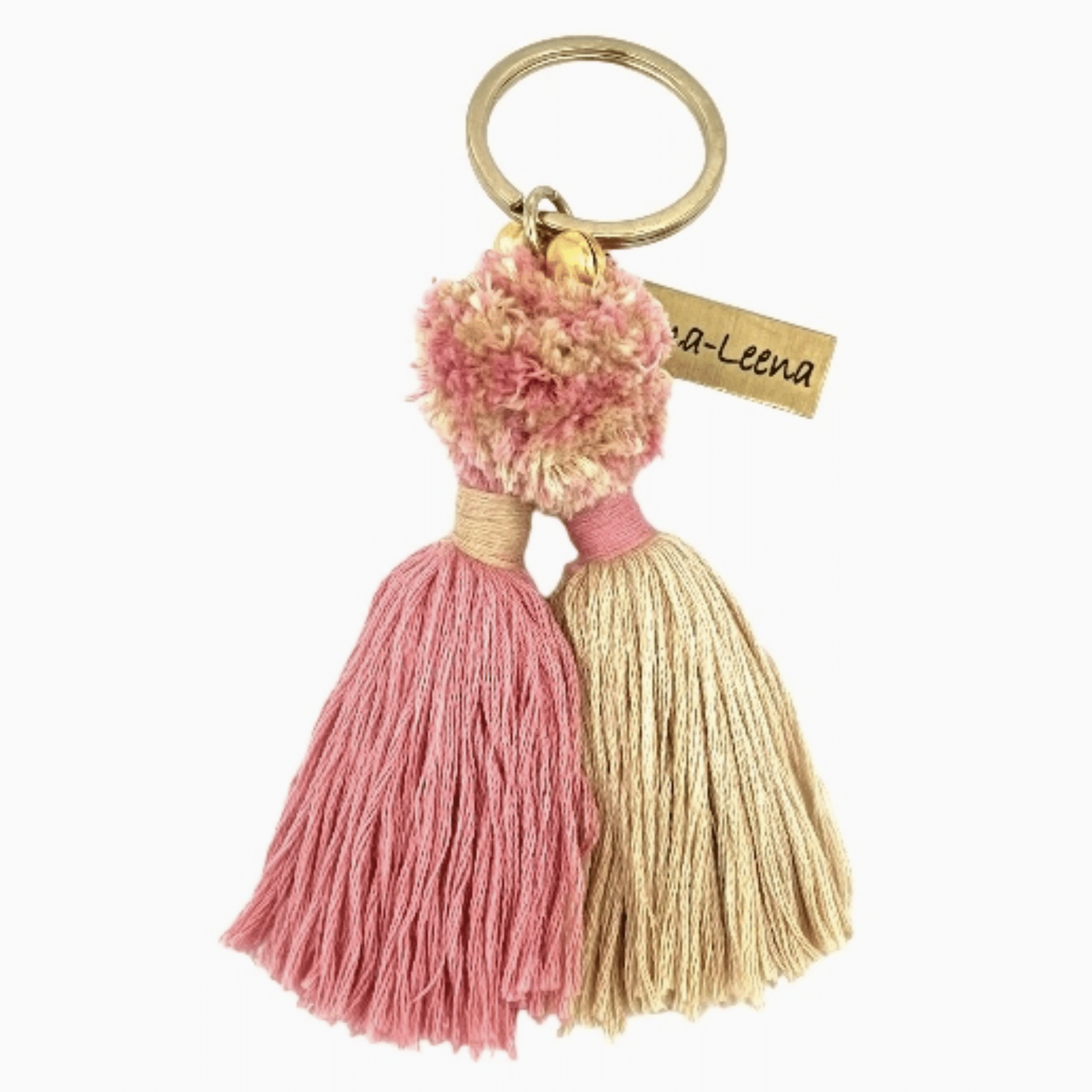 Ein nachhaltiger Schlüssel- oder Taschenanhänger mit doppelten Quasten in wunderschönen, weichen Farben wie Rosa und Sand, mit einer gemischten kleinen Bommel und goldenen Glöckchen oben auf der Bommel.