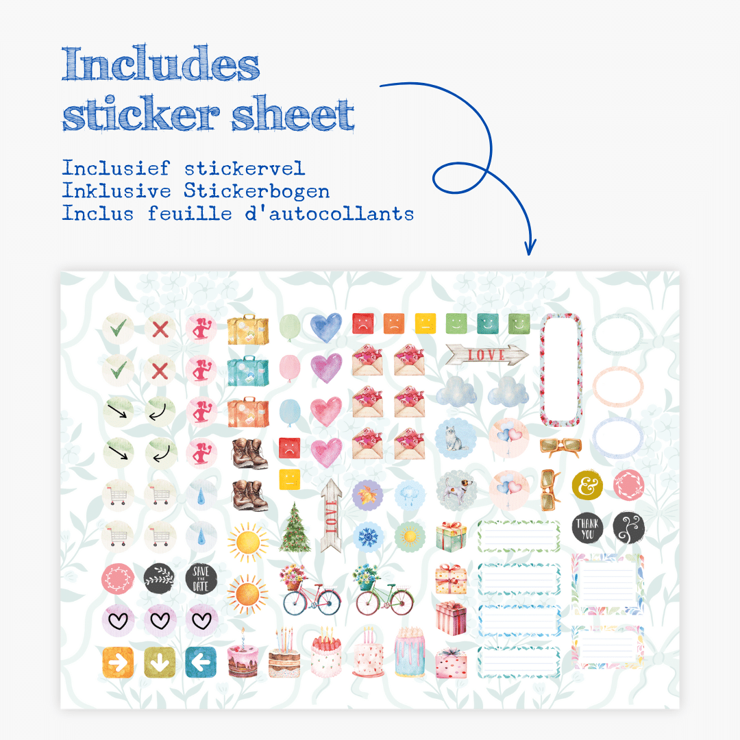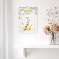 Ce magnifique calendrier est imprimé sur du papier gaufré de luxe et relié par une wire-o couleur bronze. En bonus, une grande feuille d’autocollants se trouve à l’arrière – pratique et amusant à la fois !