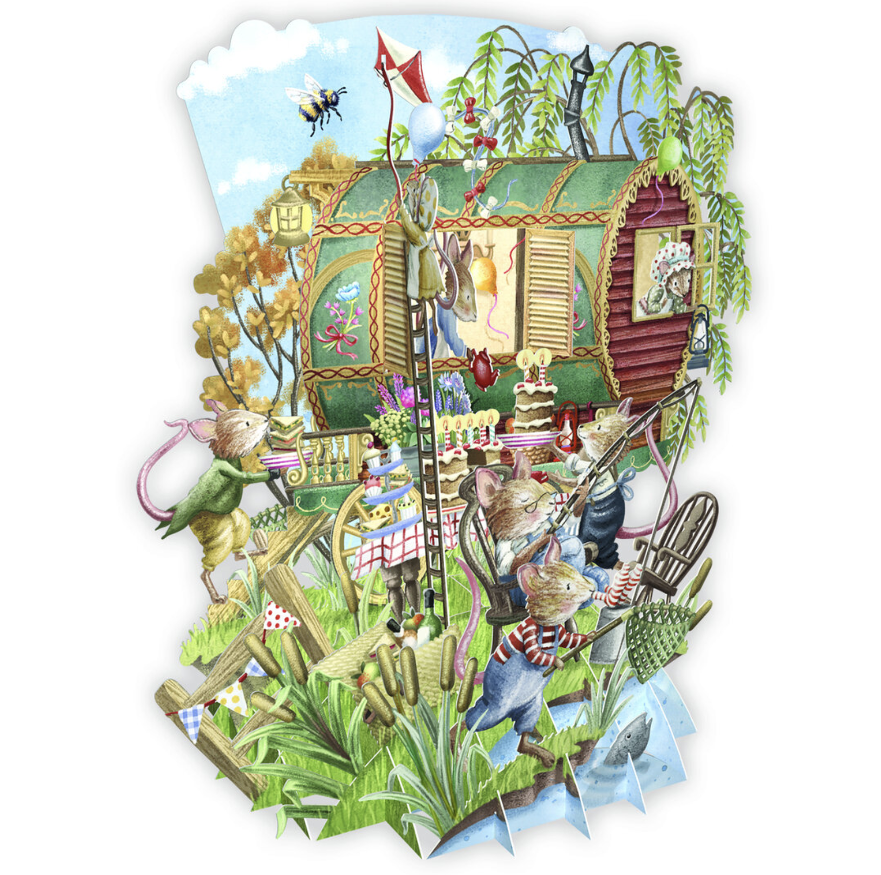 Un autre brillant exemple des compétences en matière d’artisanat du papier et des magnifiques illustrations que nous sommes en droit d’attendre de Reuben McHugh. Remplie de détails, cette belle caravane abrite une grande famille de souris, qui vivent toutes leur vie au mieux ! Cette carte fascinera et ravira tous ceux qui auront la chance de la recevoir.