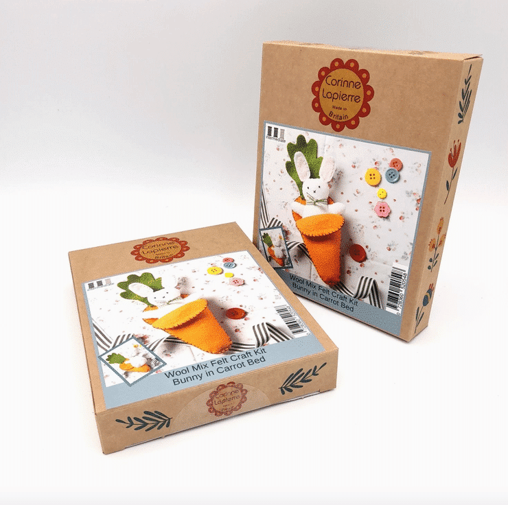 Le lapin dans son mini kit de bricolage avec son lit de carottes contient tout ce qu’il faut pour réaliser une décoration suspendue en feutre (à l’exception des ciseaux !). Ce kit comprend de la feutrine en laine douce, une aiguille, du fil à broder DMC, de la peluche, du ruban et des instructions, des gabarits et un guide de couture.