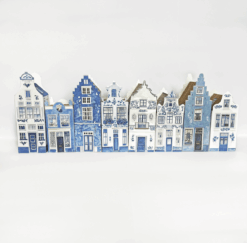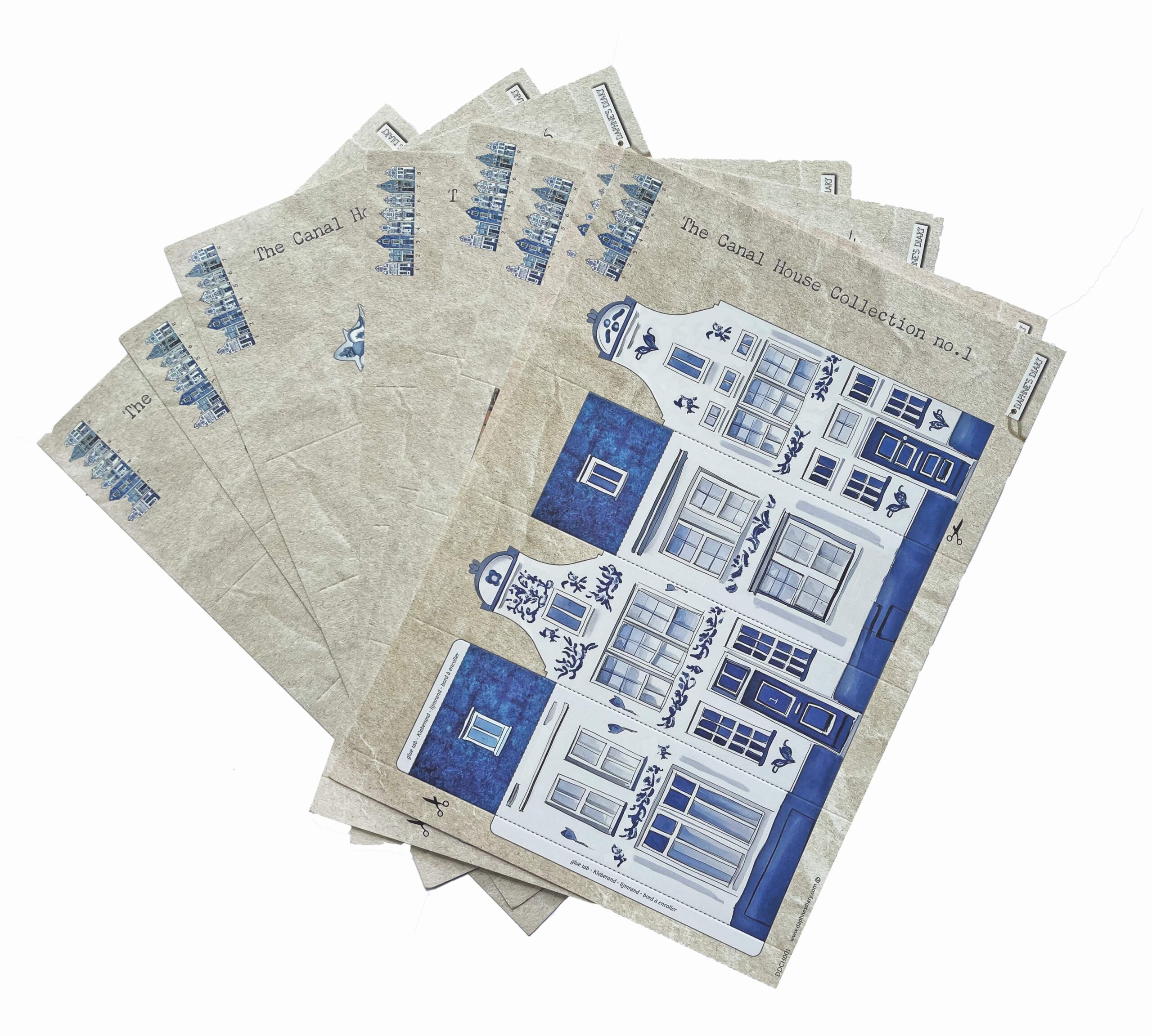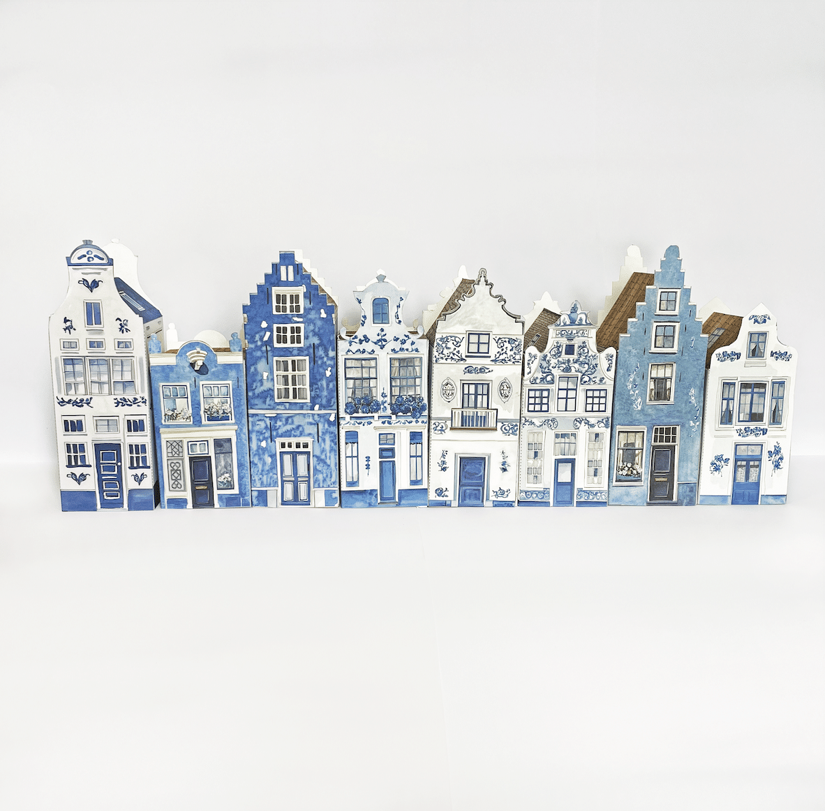 Huit maisons de canal d’Amsterdam au motif Bleu de Delft. Ces charmantes maisons miniatures sont dotées de façades caractéristiques et de détails élégants, inspirés des bâtiments emblématiques le long des canaux d’Amsterdam. Vous les recevrez sous forme de planches pré-imprimées et solides, à découper, plier et assembler vous-même. Chaque maison a sa propre façade unique. Amusant à réaliser et parfait pour décorer un bel endroit !
