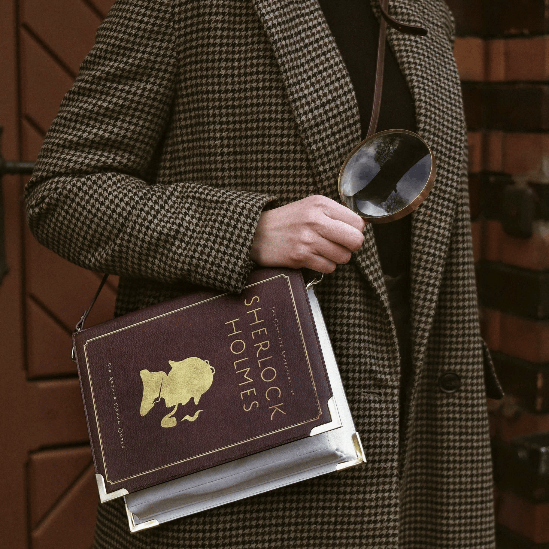 De achtergrond is rijk bordeauxrood dat opzettelijk is gevlekt om een meer verweerde uitstraling te geven. De achterkant van de tas is ook versierd met de twaalf korte verhaaltitels van Sherlock Holmes.
