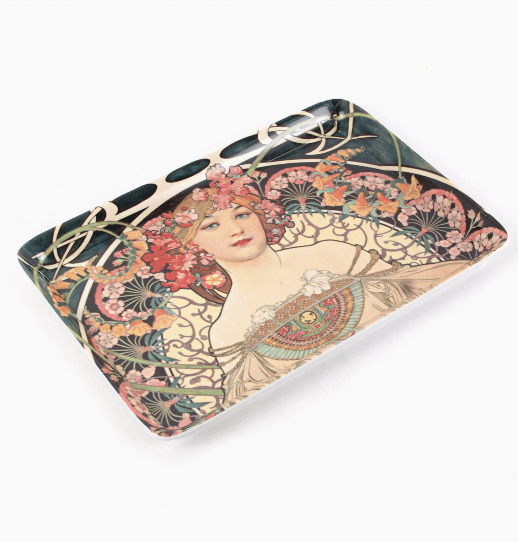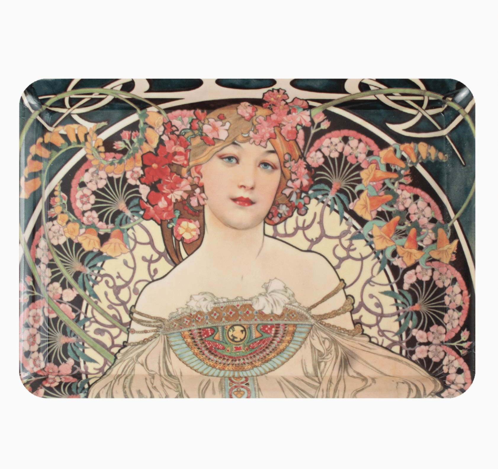 Een dienblad met een hoogwaardige print gebaseerd op een schilderij van Mucha. Het dienblad is gemaakt van melamine en is daardoor vaatwasmachinebestendig, maar niet geschikt voor gebruik in de magnetron.