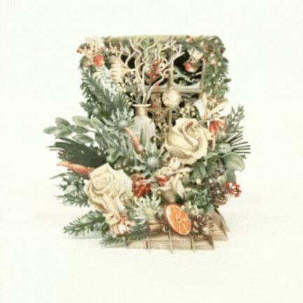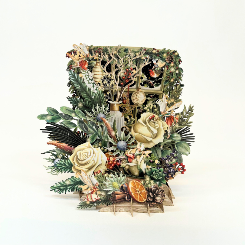 | This unique 3D pop up Christmas card design features 12 layers of intersecting panels of artwork that combine to produce a beautiful 3D image. The artwork showcases 2 large white roses, a tall vase containing swirling branches with multiple hanging ornaments and layers of light and dark green plants. Fairies fly and sit within the flowers and a small bird can be seen on the window pane in the background. The Christmas card measures 6×6 inches when flat but opens to a size of 6x4x6 inches so it can ‘stand up’ and be displayed on any flat surface. Your personal message can be written on the large panel provided on the back of the card. No assembly required. This Christmas card is a beautiful keepsake that will be treasured. From the ‘Top Of The World’ collection of 3D Laser Cut greeting cards. |