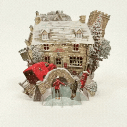 The Post Van is going to make it! All the last minute cards and gifts will be delivered on time despite the deep snow drifts all around. Christmas lights, wreaths and decorations adorn the traditional Cotswold stone building, who can resist one last visit for a traditional mince pie?