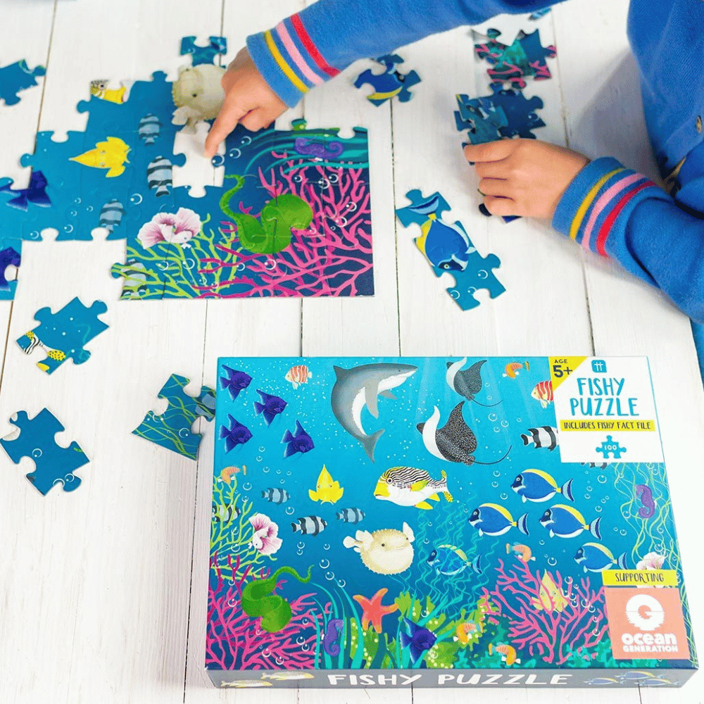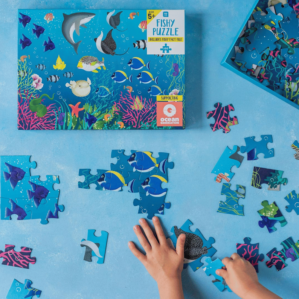 100 piece fish puzzle for kids from Talking Tables. This colorful puzzle features a variety of fish and sea creatures, including starfish, seahorses and sharks. An educational and fun way for children to learn about the magical world that hides under the sea. Use the provided fish file to learn about some of the amazing fish in our oceans and what we can do to protect them.